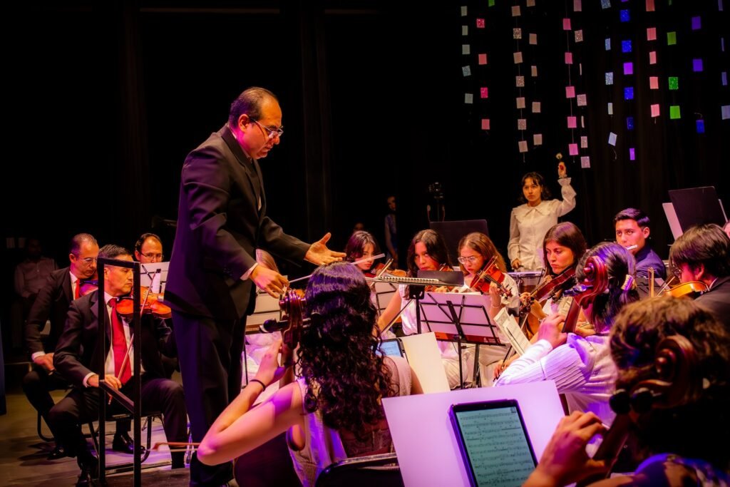 Asimismo, la agrupación participó en conciertos infantiles con repertorio clásico, como “Pedro y el Lobo” y la “Sinfonía de los Juguetes”, en presentaciones realizadas en el Aula Magna y en el Centro Cultural El Refugio, todo bajo la dirección del maestro Cano.